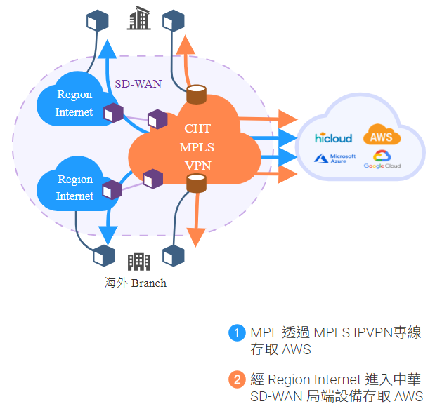- The customer used multiple networks to connect locally to Chunghwa Telecom's SD-WAN backbone nodes, and through the backbone, it was able to connect to multiple public cloud services.